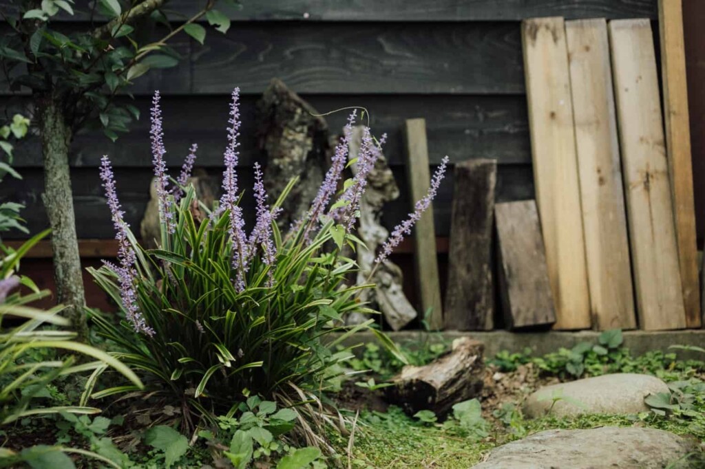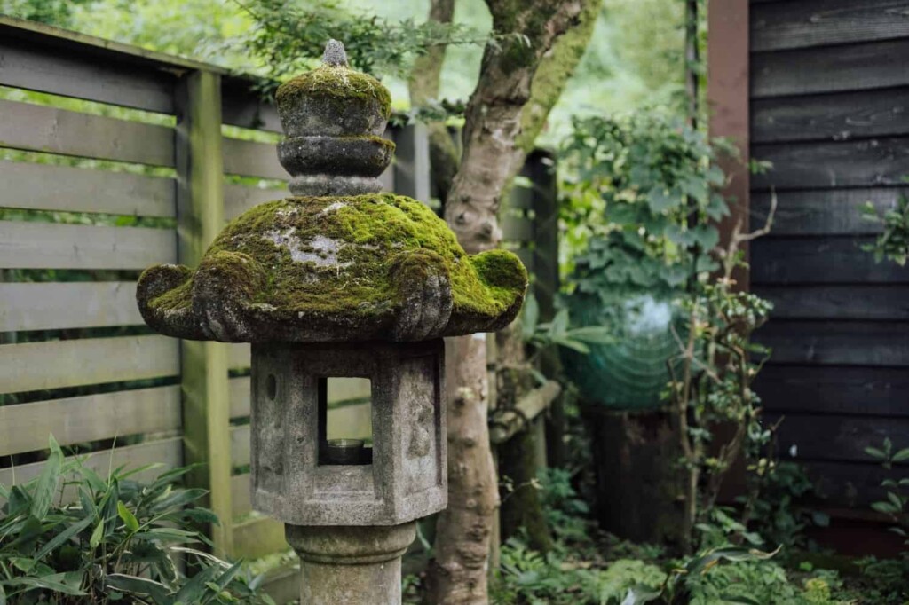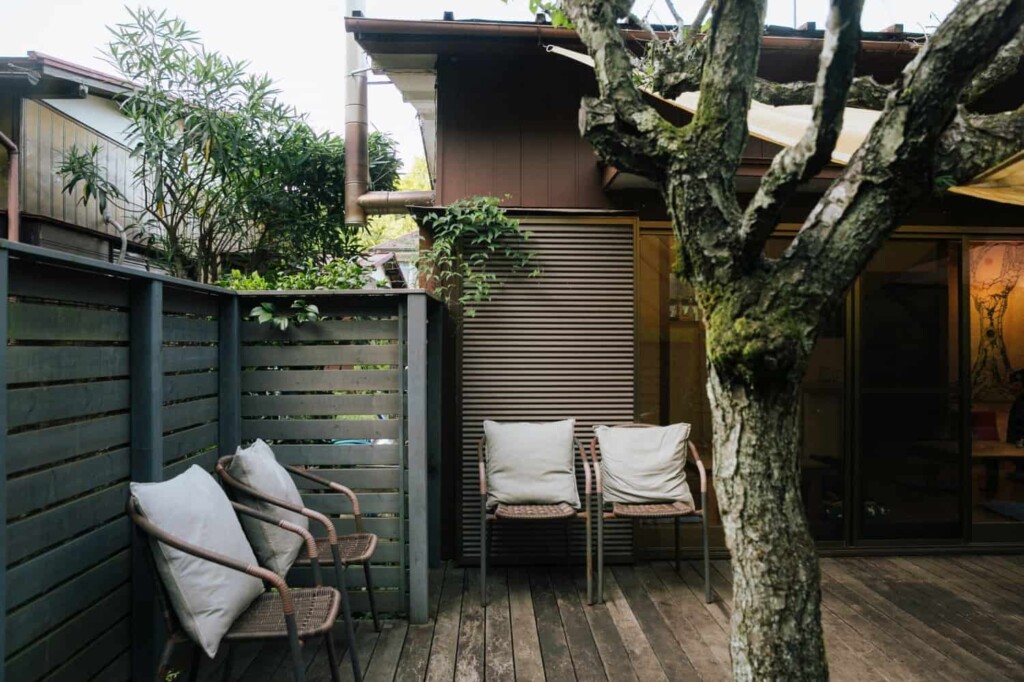 風がそよ吹くウッドデッキの先に目をやると、かつての住人が愛でていたという椿や梅の古木、苔むす石灯篭がある庭が、静かに迎え入れてくれました。
