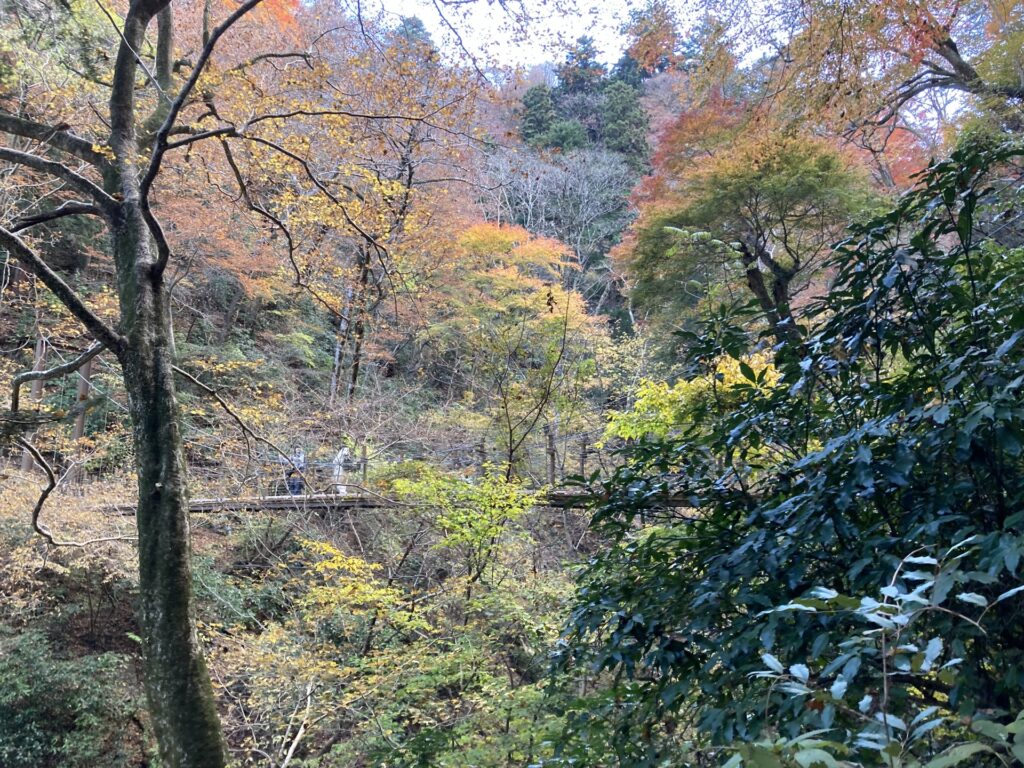 高尾山唯一の吊り橋。森の中に架かる橋と、周囲を彩るカエデやブナの紅葉は最高の被写体です。少しスリリングな体験が、紅葉狩りをさらに思い出深くしてくれます。