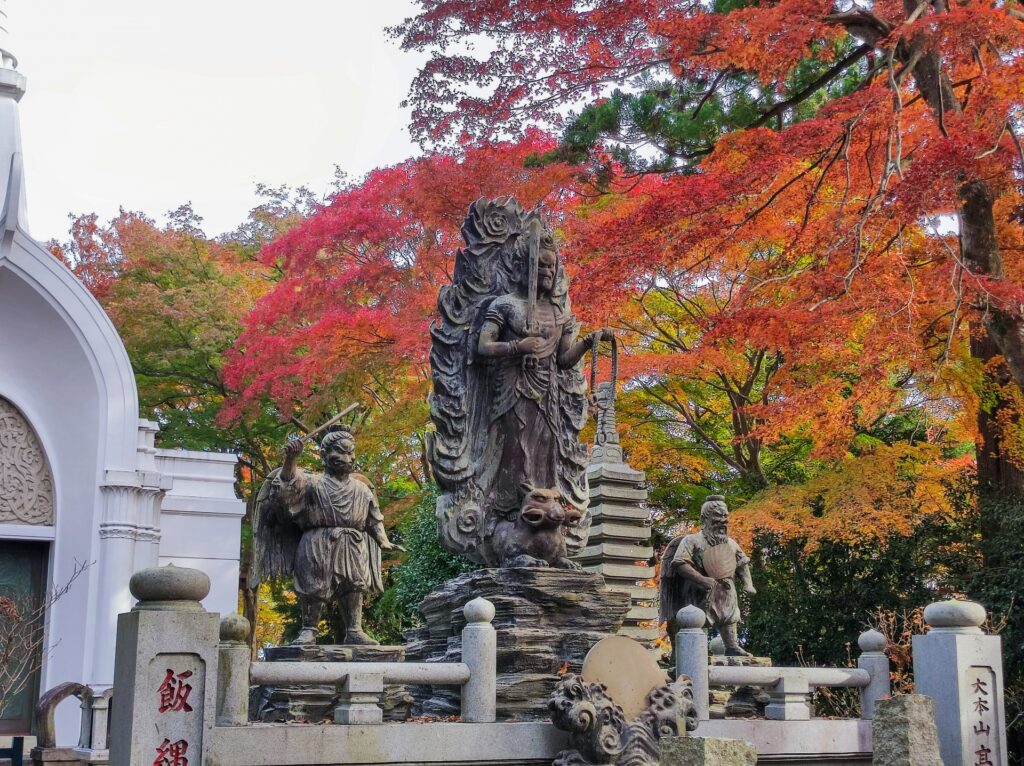 高尾山信仰の中心地、薬王院。朱塗りの山門や天狗像を、燃えるようなカエデが彩る光景は、まさに日本の秋を象徴する荘厳な美しさです。石段に舞い落ちた「敷き紅葉」も風情があります。