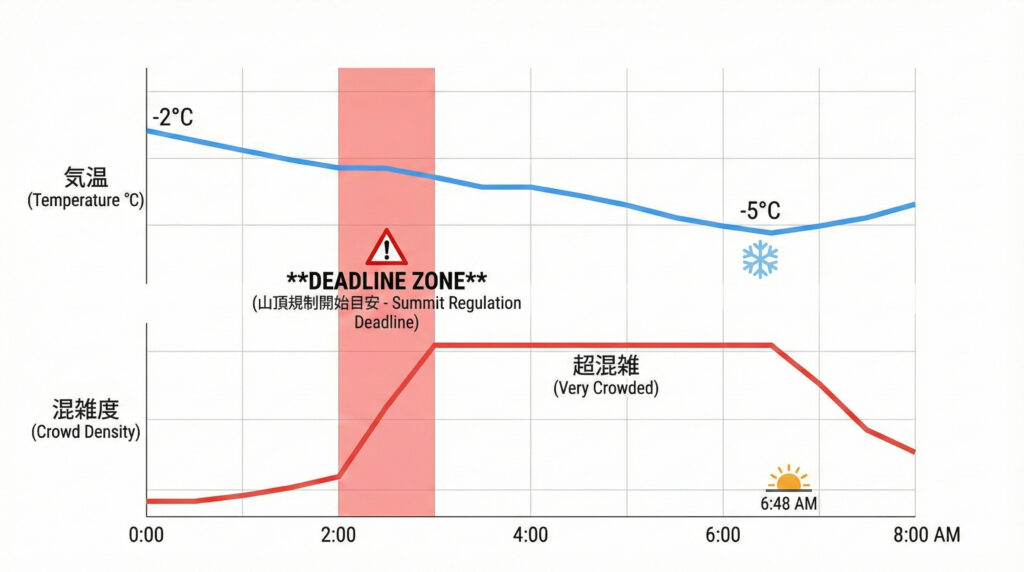 - 02:00~3:00: 【デッドライン】 この時間までに山頂付近にいないと、規制で入れない可能性大。