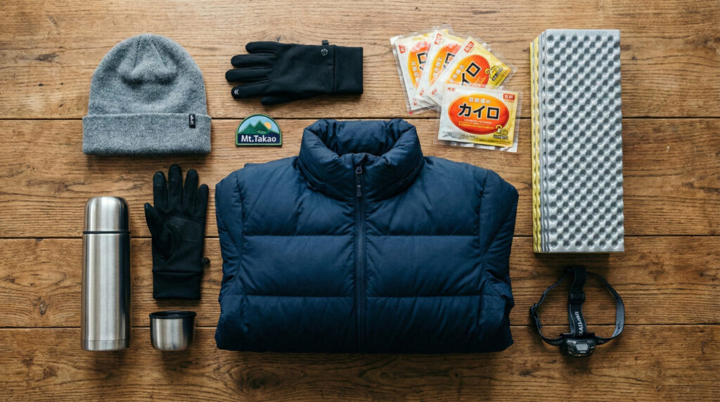 高尾山の標高は599mですが、冬の夜明け前はスキー場と同じレベルの防寒が必要です。「街歩きの冬服」では間違いなく後悔します。