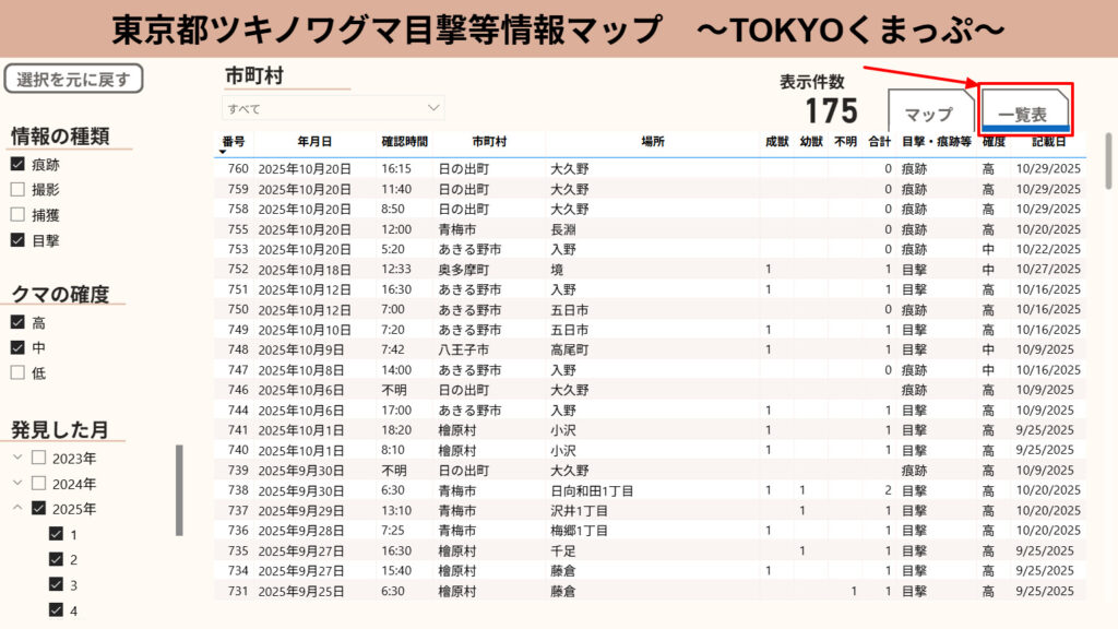 「tokyoくまっぷ」とは、東京都環境局が都内でのツキノワグマの目撃情報や痕跡(フンや爪痕など)の情報を集約し、地図上にリアルタイムで公開しているWebマップです。Microsoft社のPower BIというツールで構築されており、誰でも無料で閲覧できます。